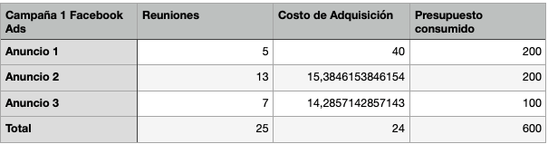 - Antes teníamos una campaña activa a la cual le poníamos 600 usd semanales y teníamos 3 anuncios que de manera semanal nos traian 20 reuniones semanales. Esto quiere decir que el costo de adquisición era de 30 usd.