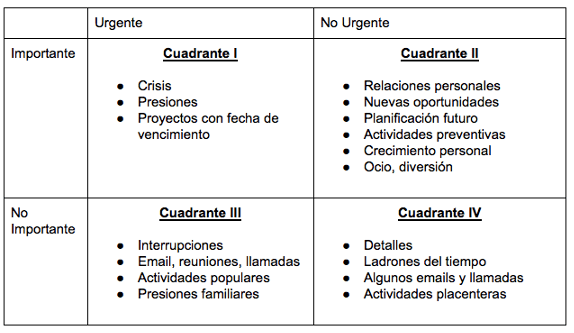Si vemos esta matriz de administración del tiempo es muy probable que a todos nos tire resolver los cuadrantes 1 y 3 («lo urgente») pero si nos ponemos a trabajar en el cuadrante 2 seguramente tengamos impacto en reducir las urgencias. El problema es que lo no urgente pretende proactividad desde nuestro lado para sentarnos a hacerlo. No son actividades que estén presentes día a día.